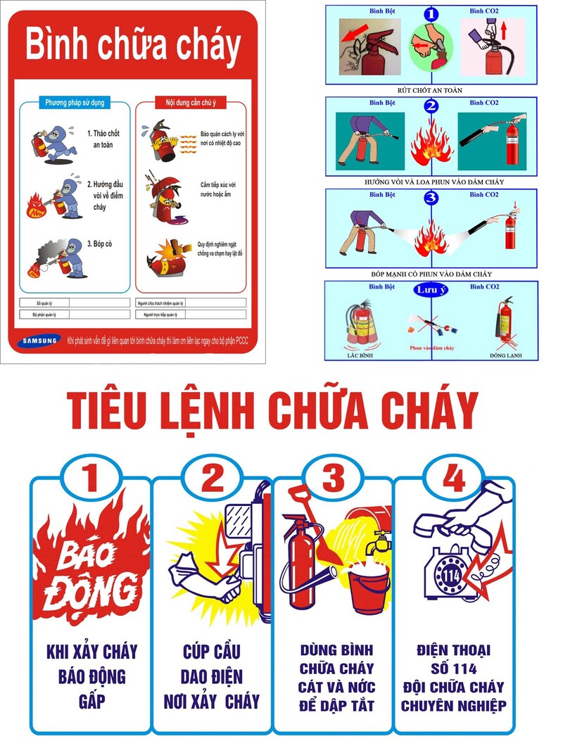- Hướng dẫn cách sử dụng bình chữa cháy đúng kỹ thuật để dập tắt đám cháy nhỏ.