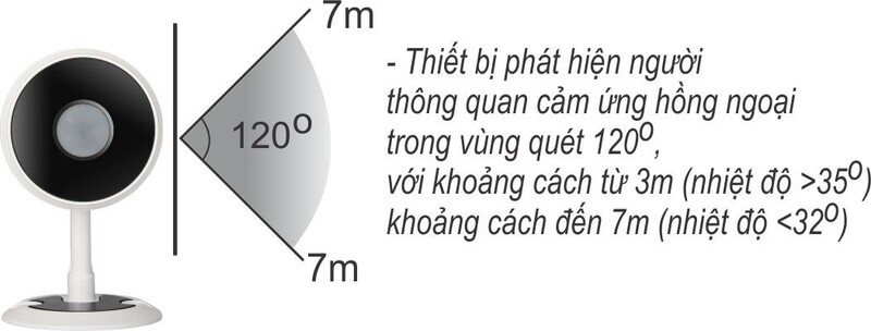 Cảm biến có góc quét 120°, bao phủ tốt khu vực cửa ra vào. Khoảng cách phát hiện linh hoạt từ 2–3m trong môi trường nóng và lên đến ~7m khi nhiệt độ thấp hơn, đảm bảo nhận diện chuyển động ổn định trong nhiều điều kiện.