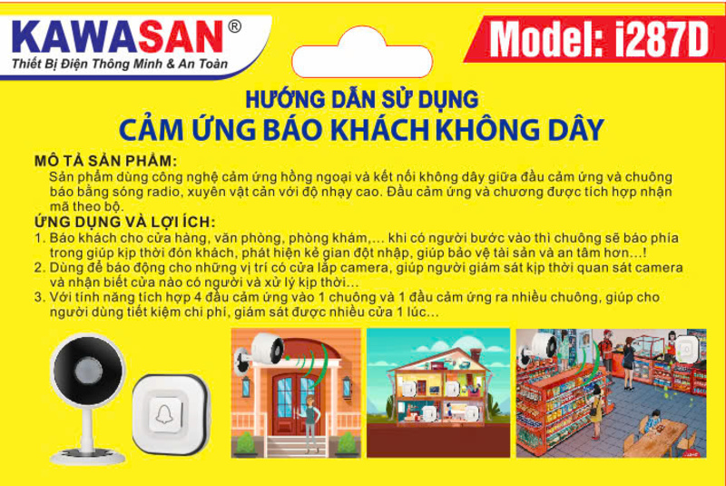 Kết lại, huông báo khách không dây Kawasan I287D là lựa chọn tối ưu cho mọi cửa hàng, văn phòng và gia đình muốn nâng cao khả năng nhận biết khách ra vào cũng như tăng cường an ninh một cách đơn giản, hiệu quả và tiết kiệm. Với công nghệ cảm biến PIR chính xác, kết nối không dây ổn định, hệ thống báo hiệu rõ ràng và thiết kế linh hoạt, thiết bị mang lại trải nghiệm sử dụng thuận tiện, không cần đi dây phức tạp hay yêu cầu kỹ thuật cao. Bên cạnh đó, khả năng mở rộng linh hoạt và độ bền cao giúp I287D phù hợp với nhiều mô hình kinh doanh từ nhỏ đến lớn, đảm bảo đáp ứng nhu cầu kiểm soát không gian trong thời gian dài. Nếu bạn đang tìm kiếm một giải pháp báo khách – báo động vừa tin cậy, vừa dễ lắp đặt và có chi phí hợp lý thì chuông báo khách không dây Kawasan I287D chắc chắn là lựa chọn đáng đầu tư.