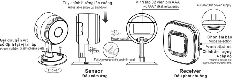 Đầu cảm biến có thể dùng 2 pin AAA hoặc adapter 5V/1A, phù hợp cho cả lắp đặt nhanh lẫn vận hành lâu dài. Đầu chuông sử dụng nguồn 90–230VAC, cắm trực tiếp vào ổ điện dân dụng.