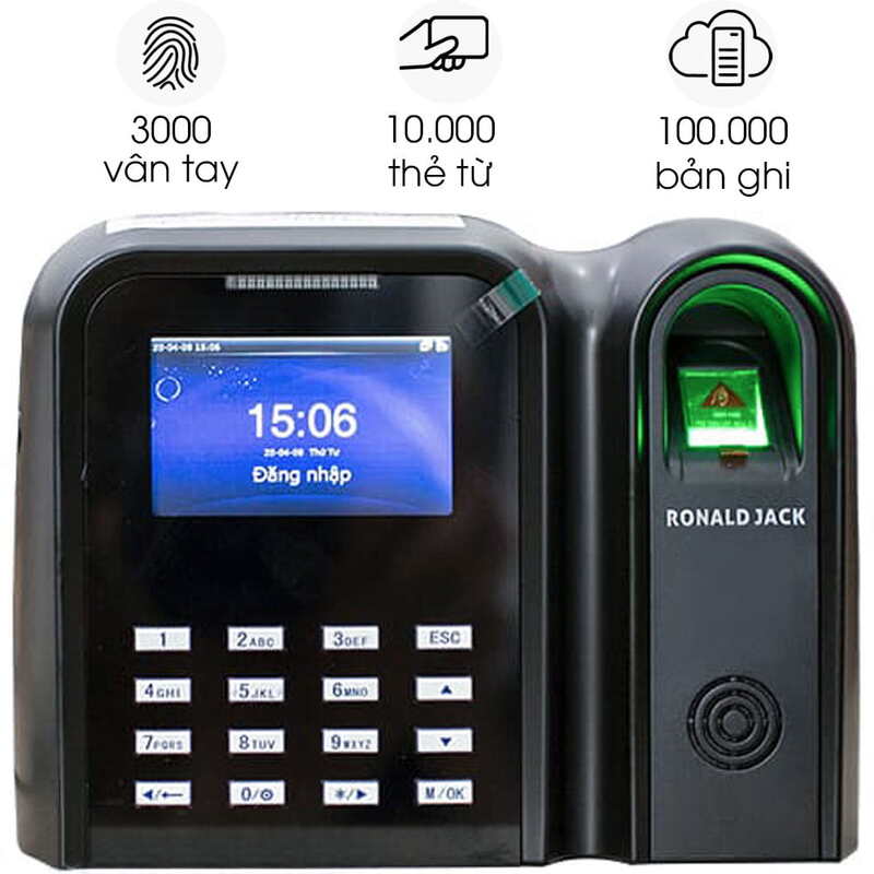 Sử dụng dấu vân tay của nhân viên để xác nhận danh tính khi chấm công. Loại máy này có độ chính xác cao, hạn chế tình trạng chấm công hộ và được sử dụng phổ biến tại nhiều văn phòng, doanh nghiệp vừa và nhỏ. Một số sản phẩm tiêu biểu như Ronald Jack 5000 AID, Ronald Jack 8000C hoặc Ronald Jack F18 đang được nhiều doanh nghiệp lựa chọn nhờ khả năng nhận diện nhanh và độ ổn định cao.