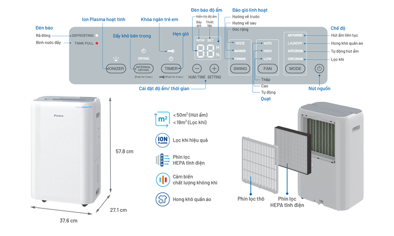 - Ngoài chức năng hút ẩm, thiết bị còn tích hợp nhiều tiện ích như hong khô quần áo, hẹn giờ, khóa trẻ em, đảo gió tự động và cảm biến chất lượng không khí hiển thị bằng đèn 5 màu.